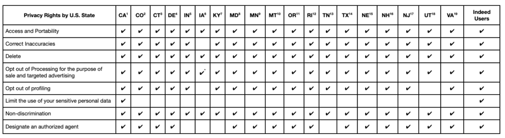 | Sensitive personal data* *as defined in U.S. privacy law. Indeed does not collect all these data categories. | A category of personal data that reveals racial or ethnic origin, religious or philosophical beliefs, union membership, medical history, mental or physical health condition, medical treatment or diagnosis, sex life, sexual orientation, sexuality, status as transgender or nonbinary, status as a victim of crime, national origin, citizenship or immigration status; genetic or biometric data that is processed for the purpose of uniquely identifying an individual; personal data collected from a known child; precise geolocation data; social security, driver’s license, state identification card, or passport number; account log-in, financial account, debit card, or credit card number in combination with any required security or access code, password, or credentials allowing access to an account; contents of a consumer’s mail, email, and text messages unless the business is the intended recipient of the communication |